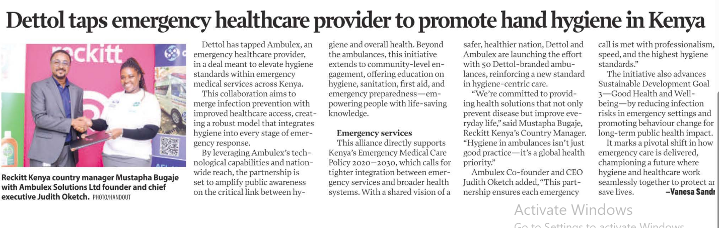 Ambulex Solutions Ltd is proud to announce a landmark partnership with Dettol Kenya, aimed at transforming emergency healthcare through enhanced hygiene practices and community education. This collaboration marks a significant step toward improving health outcomes and infection prevention during emergency response services.